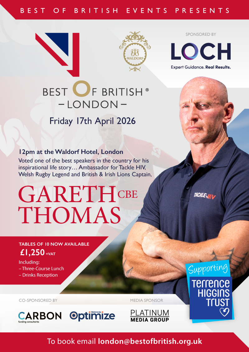 Join us at The Waldorf Hotel from midday/12pm on Friday 17th April 2026, for a Best of British and Welsh special, featuring Rugby Legend, and British & Irish Lions Captain, Gareth Thomas CBE.