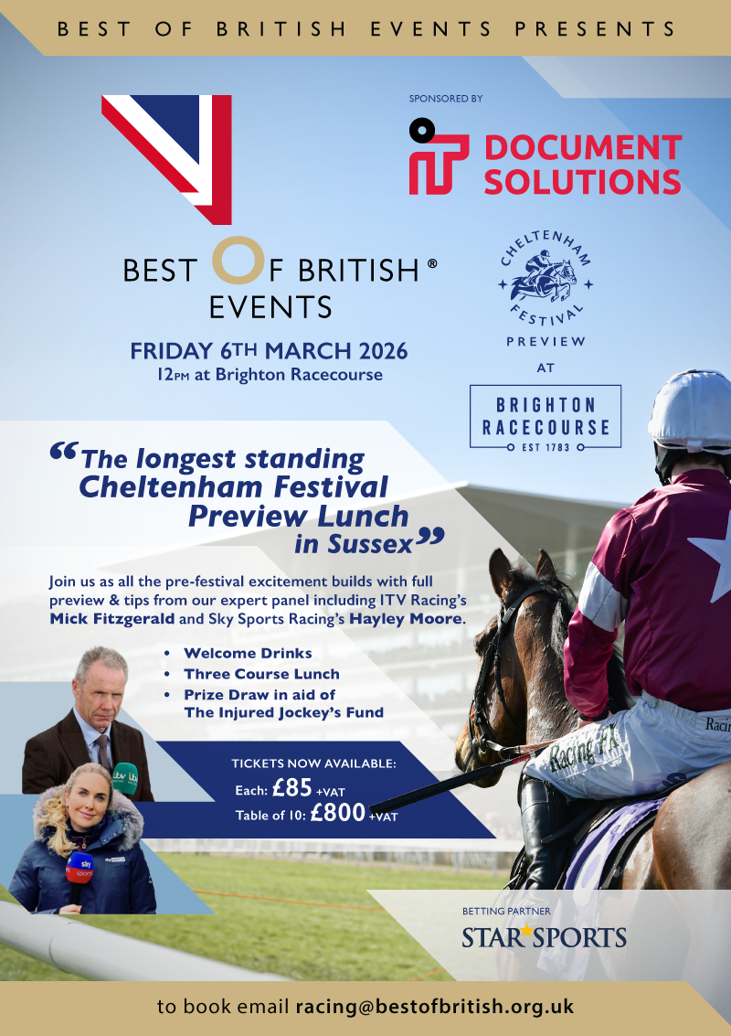 Join us at Brighton Racecourse from 12pm on Friday 6th March for an exclusive Cheltenham Festival Preview Lunch, as Best of British Events brings you closer to the people in the know ahead of the biggest week in the racing calendar.